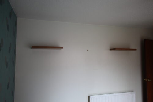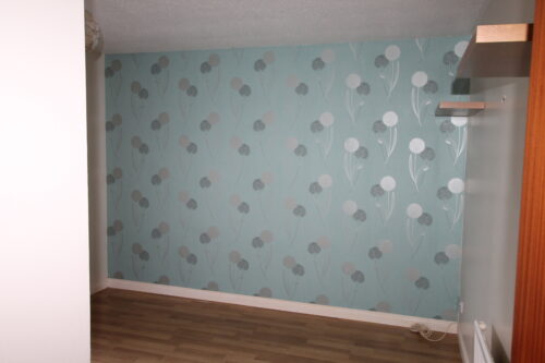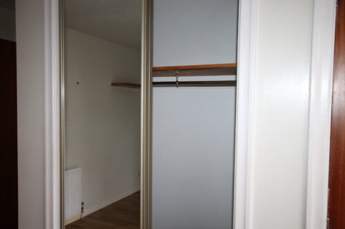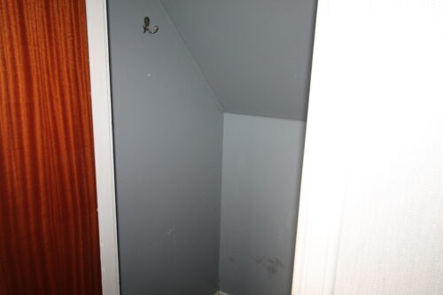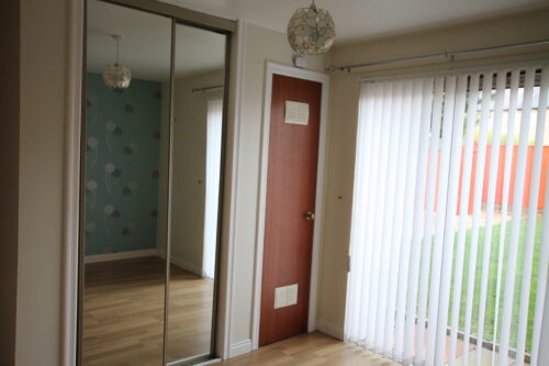 Laminate flooring, rear facing double glazed UPVC window, built in sliding mirror robes and storage cupboard with gas boiler, ceiling with light fitting, wall hung white radiator.