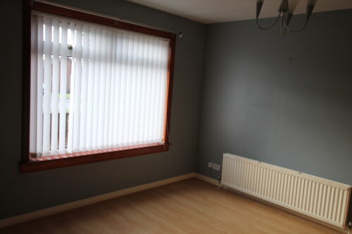Lounge with laminate flooring, front facing double glazed UPVC window, ceiling with light fitting, wall hung white radiator.