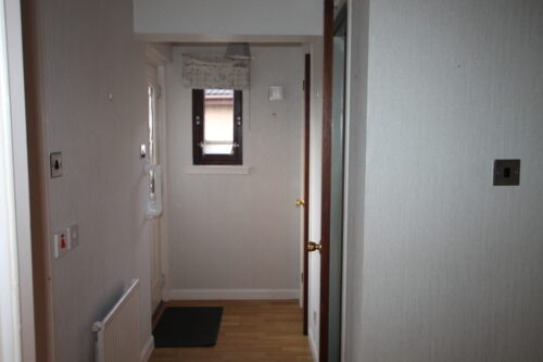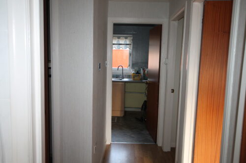 Hallway with laminate flooring, built in storage cupboards, ceiling with light fitting, access to lounge, kitchen, bedroom & wet-room.